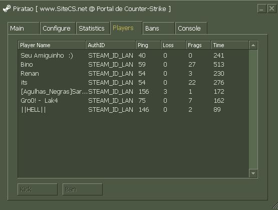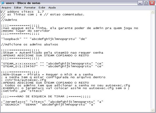 ;“SEUNICK” “SENHA” “abcdefghijklmnopqrstu” “a” Lembrese de retirar o ; ficando assim “SEUNICK” “SENHA” “abcdefghijklmnopqrstu” “a” a senha tem que estar configurada no arquivo “C:\Arquivos de “programas\valve\cstrike\autoexec.cfg” autoexec.cfg