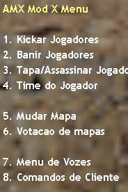 Pronto seu addons esta configurado e pronto para jogar. Lembrando que você pode mudar as stats no jogo, se você adicionou o ADMIN corretamente, digite no console amxmodmenu que ira abrir 1 menu como o da foto abaixo, por ele você pode editar tudo. Ou faça 1 bind bind “F6″ “amxmodmenu”
